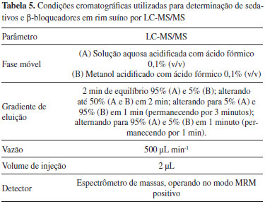 O tempo necessário para análise cromatográfica de todos os compostos por LC-MS/MS foi de 8 minutos, seguido de 2 minutos de equilíbrio, resultando em um tempo total de 10 minutos para cada injeçao de amostra. As condiçoes cromatográficas utilizadas para análise de resíduos de sedativos e β-bloqueadores em rim suíno por LC-MS/MS estao descritas na Tabela 5.