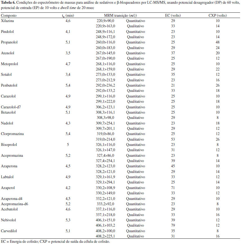 Sistema de detecçao Os parâmetros definidos para análise de sedativos e β-bloqueadores foram obtidos na etapa de infusao dos analitos e otimizaçao usando FIA, os quais sao otimizados automaticamente pelo software Analyst. Os parâmetros da fonte de ionizaçao por eletronebulizaçao no modo positivo que foram usados neste método sao gás de colisao high, voltagem do Spray eletrônico de 5500 volts, temperatura de 700 ºC, gás de nebulizaçao e gás auxiliar de 55 psi, e gás de cortina de 30 volts. Os parâmetros do espectrômetro de massas e tempos de retençao dos compostos estao decritos na Tabela 6.