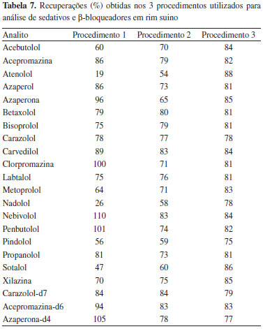 No decorrer da otimizaçao dos procedimentos de extraçao, alguns analitos apresentaram relaçao sinal/ruído baixos, já que estavam em matriz e nao mais em solvente. Para estes compostos foi realizada nova otimizaçao, desta vez manual, para garantir fragmentaçao eficiente do íon precursor e seleçao de fragmentos que apresentassem maior seletividade. Estudo de estabilidade No estudo de estabilidade, admite-se variaçao de até 15%29 nos resultados obtidos, sendo que para valores acima ou abaixo considera-se que a substância é instável a partir do período avaliado. A estabilidade das soluçoes de fortificaçao preparadas para análise de sedativos e β-bloqueadores, armazenadas a -20 ºC, no escuro, foram monitoradas durante cinco semanas e foi possível observar que todos os compostos permaneceram estáveis neste período. Os resultados de concentraçao obtidos variaram entre 4 e 8%. No estudo de estabilidade dos compostos em extrato, as amostras foram analisadas no dia do preparo e após 24 h. A variaçao dos resultados obtidos ficou entre 2 e 14%, exceto para carvedilol em que o resultado variou cerca de 27%. Assim, considera-se que os analitos sao estáveis tanto em soluçao quanto no extrato no período avaliado, com exceçao do composto carvedilol em extrato na temperatura de 20 ºC. Otimizaçao do procedimento de extraçao A etapa de extraçao dos compostos é uma das mais relevantes, devido à complexidade da matriz e os baixos níveis de concentraçao desejados. A matriz, rim suíno, é constituída basicamente por cerca de 80% de água, 16% de proteínas, 3% de gorduras totais, e 1% de vitaminas e minerais.30 Além disso, conforme mostrado na Tabela 2, o coeficiente de partiçao octanol água dos analitos varia de 0 a 4.31 A utilizaçao de acetonitrila é uma opçao interessante, pois permite a extraçao de compostos com faixa de polaridade mais ampla, quando comparado a outros solventes como acetato de etila, acetona, metanol, água, entre outros. A adiçao de sal, além de possibilitar a retirada de água do sistema, tem efeito salting out, transferindo os analitos da fase aquosa para fase orgânica.32 Para a retirada de proteínas e gorduras da amostra, um procedimento bastante comum como alternativa de purificaçao é o congelamento do extrato da amostra à baixa temperatura (-20 ºC), pois auxilia na precipitaçao destes interferentes, os quais podem ser posteriormente removidos do extrato por centrifugaçao.33 Outra prática, que substituiria a SPE, corresponde à Dispersao em Fase Sólida, d-SPE, que consiste na utilizaçao de sorvente que atua como filtro na retirada de coextrativos. A utilizaçao desta técnica é uma alternativa simples e rápida, em que a adiçao do sorvente escolhido é realizada diretamente no extrato, seguido de agitaçao para homogeneizaçao da amostra e centrifugaçao para separaçao extrato/sorvente.34,35 Quando se deseja determinar concentraçoes muito baixas, uma etapa de pré-concentraçao do extrato torna-se necessária. Uma opçao interessante e viável, em substituiçao à SPE, seria a evaporaçao à temperatura controlada, sob fluxo de nitrogênio. Recuperaçao Tendo em vista as características da matriz e dos compostos, os procedimentos foram propostos com o intuito de garantir a máxima extraçao dos analitos e limpeza eficiente do extrato, para posterior análise por LC-MS/MS. A Tabela 7 apresenta os resultados de recuperaçao obtidos para os 3 procedimentos propostos.