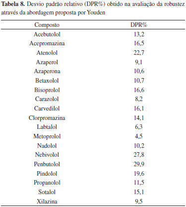 O procedimento 1 proporcionou recuperaçoes baixas para atenolol, nadolol e sotalol (19%, 26% e 47%, respectivamente). Estes compostos apresentam log Kow muito próximo de zero, portanto, é provável que a etapa de partiçao tenha sido ineficiente e os compostos tenham sido removidos do extrato juntamente com a água. Para os demais analitos, o procedimento apresentou recuperaçoes que variaram entre 56 e 110%. A utilizaçao de menor quantidade de amostra no procedimento 2 permitiu a quantificaçao de todos os analitos, porém apresentando como grande vantagem a obtençao de extrato mais límpido. Neste procedimento foi possível observar uma melhora significativa nas recuperaçoes obtidas para atenolol, nadolol e sotalol, que foram de 54%, 58% e 60% respectivamente, provavelmente devido à retirada da etapa de partiçao. Com isso, o extrato foi evaporado contendo a água oriunda da matriz. Cabe ressaltar que este procedimento se tornou bastante oneroso devido ao tempo gasto para evaporaçao do extrato obtido (cerca de 11 mL), que permaneceu sob fluxo de nitrogênio, a 50 ºC, por cerca de 3 a 4 horas. Para os demais compostos, as recuperaçoes obtidas ficaram entre 65 e 84%. O procedimento 3 consistiu no procedimento 2 otimizado, com o objetivo principal de reduzir o tempo de análise (pela diminuiçao no tempo de evaporaçao), além de diluir a amostra, reduzindo a quantidade de coextrativos a serem inseridos no sistema cromatográfico. Para isso, a etapa de purificaçao utilizando celite® 545 foi antecipada, sendo realizada logo após a precipitaçao de proteínas à baixa temperatura. Uma alíquota de 1 mL do extrato foi retirada para evaporaçao sob fluxo de N2 a 50 ºC. Esta otimizaçao reduziu significativamente o tempo de evaporaçao para cerca de 20 min. As recuperaçoes obtidas neste procedimento foram satisfatórias para todos os compostos, proporcionando valores de recuperaçao entre 75 e 88%. Portanto, o procedimento 3 descrito foi escolhido para análise de sedativos e β-bloqueadores em rim suíno devido suas vantagens de custo, praticidade e valores de recuperaçoes satisfatórios para todos os compostos. Procedimento de extraçao para análise de sedativos e β-bloqueadores O procedimento 3 selecionado consistiu em extraçao simples com solvente orgânico, seguido de etapas de purificaçao à baixa temperatura e d-SPE, além de etapa rápida de concentraçao da amostra sob fluxo de N2 e, por fim, retomada da amostra para posterior análise por LC-MS/MS. O tempo total do procedimento de extraçao foi de no máximo 5 horas para cerca de 50 amostras, o que corresponde a aproximadamente 6 minutos por amostra. A utilizaçao de acetonitrila na etapa de extraçao permitiu recuperaçoes satisfatórias para todos os compostos, independente de sua polaridade, além de reduzir a extraçao de coextrativos presentes no rim suíno, principalmente gorduras, quando comparado ao uso de solventes como metanol. O uso de homogenizador mecânico aumenta significativamente a superfície de contato solvente/matriz, permitindo melhor extraçao dos compostos. O uso de mesa agitadora por 20 minutos teve como principal objetivo favorecer a precipitaçao de proteínas, enquanto a posiçao dos tubos no sentido horizontal favorece a agitaçao. A última etapa, de centrifugaçao, é necessária para separar o extrato da matriz para posterior etapa de purificaçao. Na etapa de purificaçao, dois procedimentos simples foram empregados. A precipitaçao de proteínas à baixa temperatura é uma alternativa de purificaçao bastante difundida. Após uma hora já foi possível observar a deposiçao de quantidade significativa de proteínas que ficaram retidas no fundo do tubo após centrifugaçao. A adiçao de celite® 545 como sorvente para d-SPE teve como objetivo retirar principalmente gordura, além de proteínas e fosfolipídios, que podem estar presentes nesta matriz e que sao coextrativos de difícil remoçao. A grande vantagem na utilizaçao deste sorvente está relacionado ao baixo custo se comparado a sorventes como C18 e PSA. A etapa de concentraçao consiste na utilizaçao de recurso simples de evaporaçao sob temperatura controlada e fluxo de N2. Este procedimento é bastante rápido e eficiente, e é necessário já que os níveis de concentraçao a serem alcançados neste procedimento sao significativamente baixos. Robustez O estudo da robustez tem por objetivo demonstrar que o procedimento em questao apresenta resultados confiáveis, mesmo quando sujeito a pequenas variaçoes como diferentes fabricantes de insumos, colunas cromatográficas, concentraçoes de fase móvel, entre outros.36 Uma alternativa sugerida pela 2002/657/CE37 seria a verificaçao da robustez por meio da abordagem de Youden.28 A Tabela 8 apresenta os resultados de desvio padrao relativo obtidos no estudo de robustez utilizando o procedimento 3.