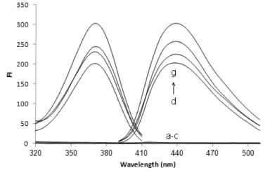 ![]() Figure 1. Excitation and emission spectra for triamterene (TM) after cloud point extraction (CPE) of (a) a reagent blank, (b) a urine blank, (c) a plasma blank, (d) a plasma sample spiked with 450 µg L-1 TM, (e) a TM standard solution (450 µg L-1), (f) a urine sample from 10-14 h after TM was administered to a volunteer, and (g) the same sample (as described in f) spiked with 75 µg L-1 TM. Conditions: 0.5 mL of urine or plasma sample; 0.05 mol L-1 phosphate buffer (pH 7.0); 2.5% (w/v) NaCl; 0.05% (v/v) Triton X-114; 40 °C for 10 min; 5 min centrifugation at 3800 rpm; surfactant-rich phase diluted to 700 µL with a 2:1 (v/v) mixture of EtOH and water