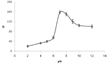 Effect of pH The pH was clearly the main parameter that affected the CPE because it affects the state of the analyte and its extraction efficiency. The effect of the sample pH on the extraction of TM was tested at pH values between 2 and 12. The solution was adjusted to pH 2 and pH 12 using dilute HCl and NaOH, respectively. The solution was adjusted to between pH 4 and 6 using acetate buffer and to between pH 7 and 10 using phosphate buffer. As is shown in Figure 2, the TM signal intensity increased as the pH was increased from 2.0 to 7.0, and then remained approximately constant at the maximum intensity at pH values of 7.0-8.0. The molecule must be in its neutral form for it to be adequately extracted by nonionic micelles in a CPE system. It seems that this was achieved for TM at pH values of 7.0-8.0, so the solutions in later tests were adjusted to pH 7.0 by adding 1.0 mol L-1 phosphate buffer. The analytical signal decreased at pH values higher than 8.0, although the mechanism that caused this is not clear.