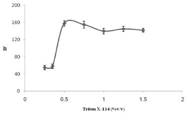 Effect of the Triton X-114 concentration The influence of the Triton X-114 concentration on the TM signal was examined by adding different volumes, between 0.25 and 1.5 mL, of 1% (v/v) Triton X-114. It can be seen from Figure 3 that the highest (and consistent) fluorescence intensities were found when 0.5-0.75 mL of Triton X-114 was used. Therefore, 0.5 mL of Triton X-114 (corresponding to a final concentration of 0.05%) was selected as the optimum for use in later tests.