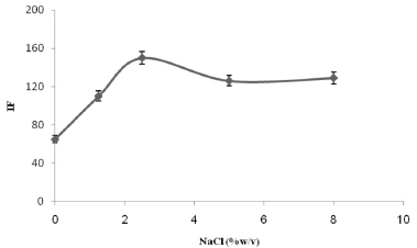 Effect of adding salt The effect of adding salt on the analysis was determined by adding different amounts, from 0% to 10% (w/v), of NaCl while keeping the other experimental conditions constant. Increasing the ionic strength caused the TM signal to increase in size when the NaCl concentration was between 0% and 2.5%, and the signal gradually decreased in size as the salt concentration was increased further (see Figure 4). Therefore, a NaCl concentration of 2.5% (w/v) was selected as the optimum for the CPE procedure.