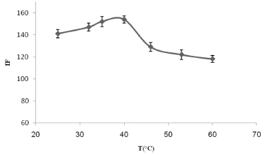 Effects of other experimental factors It is necessary to use the optimal incubation time and equilibration temperature to allow the phases to be separated easily and to ensure the complete extraction of the analyte is achieved. Extractions were carried out at different temperatures (ranging from 25 to 60 ºC) in a thermostated water bath, for periods ranging from 10 to 30 min. The strongest (and consistent) TM signals were obtained at 35-40 ºC (see Figure 5) after 10 min. Using higher temperatures led to a slight decrease in the size of the analytical signal, which was probably caused by the instability of the target analyte at such temperatures. A centrifuge time of 5 min at a speed of 3800 rpm was found to be optimal to separate the phases.