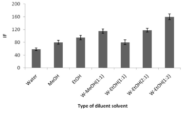 Finally, the effect of the diluting agent used was studied by adding different solvents at different ratios to the SR phase. The results (shown in Figure 6) showed that using a 1:2 (v/v) mixture of water and EtOH gave the highest (and consistent) analytical signals, so this solvent mixture was used in the rest of the work presented here.