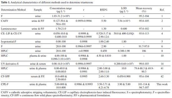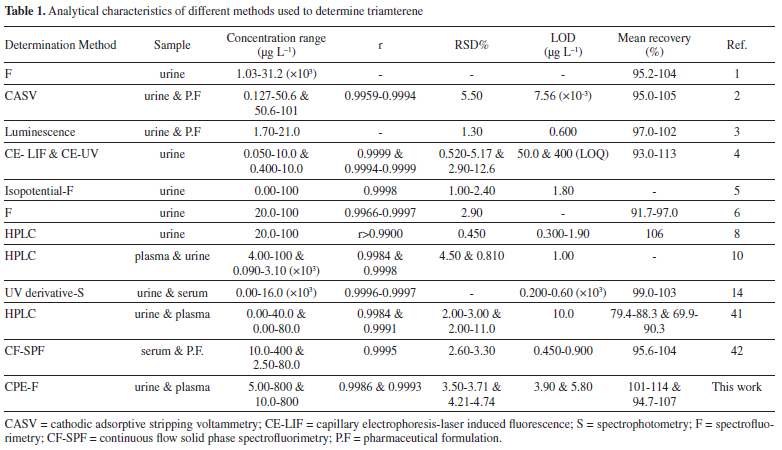 IBiotechnology Research Center, Tabriz University of Medical Sciences, Tabriz, Iran Recebido em 21/01/2014 * e-mail: a.bavili@tbzmed.ac.ir A new analytical approach was developed involving cloud point extraction (CPE) and spectrofluorimetric determination of triamterene (TM) in biological fluids. A urine or plasma sample was prepared and adjusted to pH 7, then TM was quickly extracted using CPE, using 0.05% (w/v) of Triton X-114 as the extractant. The main factors that affected the extraction efficiency (the pH of the sample, the Triton X-114 concentration, the addition of salt, the extraction time and temperature, and the centrifugation time and speed) were studied and optimized. The method gave calibration curves for TM with good linearities and correlation coefficients (r) higher than 0.99. The method showed good precision and accuracy, with intra- and inter-assay precisions of less than 8.50% at all concentrations. Standard addition recovery tests were carried out, and the recoveries ranged from 94.7% to 114%. The limits of detection and quantification were 3.90 and 11.7 µg L-1, respectively, for urine and 5.80 and 18.0 µg L-1, respectively, for plasma. The newly developed, environmentally friendly method was successfully used to extract and determine TM in human urine samples. INTRODUCTION 6-Phenyl-2,4,7-pteridinotriamine (triamterene; TM) is a mild diuretic that belongs to the potassium-sparing family of diuretics and acts directly on distal tubular cells to decrease the release of potassium ions and, as a result, avoid the reabsorption of chloride ions. By itself, TM is a relatively inefficient hypertensive, so it is usually used with another, more potent diuretic (e.g., a thiazide or anthranilic acid derivative). This gives a synergistic effect in which the diuretic and hypotensive actions of the two components are mutually enhanced.1 Using a potassium-sparing diuretic and an angiotensin II receptor blocker may increase the risk of severe hyperkalemia. This is most important for patients with diabetes, heart failure, dehydration, or renal insufficiency, or patients taking more than 25 mg d-1 of spironolactone, because these patients may have an increased risk of developing severe hyperkalemia.2 Determining TM in biological fluids is necessary to gather enough information to diagnose hyperkalemia. After oral administration, TM is absorbed at a rate of about 80%, and it is metabolized by hydroxylation followed immediately by conjugation, giving its main metabolite, hydroxyltriamterene sulfate (HTMS). HTMS is pharmacologically active, and therefore, contributes to the pharmacological profile of TA, so it is as important to determine HTMS as to determine TM.3 The concentration of HTMS is typically between four and 13 times higher than the concentration of TA in urine. The metabolism of TA takes place in the liver, so patients with liver cirrhosis and ascites have impaired abilities to form and excrete HTMS, and the rate of excretion of unmetabolized TA is enhanced in such patients. It has been proposed that the HTMS/TA ratio in plasma and urine can be used as a simple diagnostic test for hepatic function.4 Diuretics have, in recent times, been abused by sportspeople with two main objectives, to rapidly lower the bodyweight and to decrease the concentration of medical drugs in the urine by diluting the urine (to make it difficult to detect doping substances in the urine). There are no medical reasons justifying the rapid loss of weight for participants of any sport, and, in fact, abusing drugs that are used to achieve rapid weight loss can pose serious health risks because of adverse secondary effects. Therefore, TM is included in the list of substances forbidden by the International Olympic Committee.5,6 Several methods have been reported for the determination of TM and its metabolites in biological fluids, including high performance liquid chromatography (HPLC),7-12 gas chromatography mass spectrometry (GC-MS),13 isopotential fluorometry,5 fluorescence spectrometry using solid supports,3 fluorimetry or spectrophotometry in combination with multivariate calibration methods,1,6,14 capillary zone electrophoresis (CZE) using fluorescence detection,4 and square-wave voltammetry.2 These are reliable methods for determining TM concentrations in biological fluids, but they are often time-consuming and technically demanding, and require the use of costly, highly specialized instruments such as HPLC, GC-MS, and CZE. Some of the methods involve sample pretreatment and lengthy extraction procedures before the analyte can finally be analyzed. These methods, therefore, require large amounts of organic solvents, which are harmful to humans and the environment. Simple, effective, and environmentally friendly procedures for extracting TM and other drugs from biological fluids are still required. The unique behavior of micellar surfactant solutions at the cloud point has been attracting increasing amounts of attention for use in sample extraction and preconcentration procedures. Cloud point extraction (CPE) has been recognized as an alternative to conventional extraction systems because it offers the following advantages: compounds of different types and natures are dissolved well; solutes can be concentrated, with good recoveries being achieved; it is a relatively safe and cost-effective system; very small amounts of relatively non-flammable and non-volatile surfactants are required; the surfactant is easy to dispose of; the system is compatible with micellar or hydro-organic HPLC mobile phases; and the surfactants inhibit the adsorption of non-polar analytes to glass surfaces.15 The principles, advantages, and applications of CPE have been the subjects of several review articles,16-19 and the analytical potential of CPE has been demonstrated in many studies of its use extracting and preconcentrating both organic15,20-29 and inorganic compounds.30-38 All of these studies have indicated that CPE ha