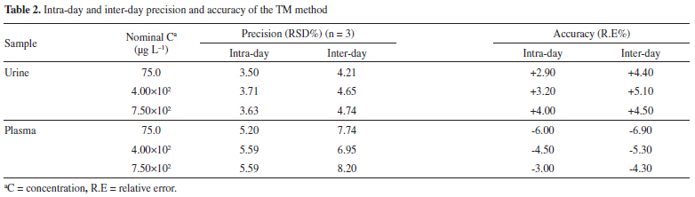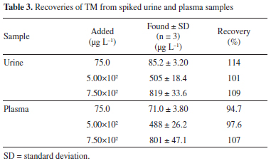 Calibration and validation The linearity of the method was evaluated using 0.5 mL aliquots of urine and plasma samples spiked with different concentrations of TM, as specified in Table 1. The equations for the plots of fluorescence intensity (FI) against the TM concentration (C, in micrograms per liter) were FI = 0.5721 C - 12.62 (n = 6) and FI = 0.4894 C - 9.258 (n = 6) for the urine and plasma, respectively, and the linear regression coefficients (r) were 0.9986 and 0.9993, respectively. The limit of detection (LOD) and the limit of quantification (LOQ) were 3.90 and 11.7 µg L-1, respectively, for urine and 5.80 and 18.0 µg L-1, respectively, for plasma. The LOD and LOQ were defined as 3Sb/m and 10Sb/m, respectively, where Sb is the standard deviation of the blank measurements and m is the slope of the calibration line. The parameters for the proposed method are summarized in Table 1.