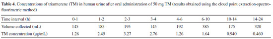 Typical spectra for a TM standard solution, blank urine and plasma samples, a urine sample from a volunteer, and the urine sample spiked with TM are shown in Figure 1. No additional peaks caused by interfering compounds were observed at the emission wavelength that was used. Therefore, the similarities in the excitation and emission spectra found in each of the sample types and the reasonable recoveries that were found indicated that there were no significant matrix effects on the proposed method. Potential interferences by species that commonly accompany TM in pharmaceuticals were also studied. The proposed method showed a high degree of tolerance for other species that are frequently found with TM. The specificity of the assay was also investigated by analyzing samples containing TM in the absence and presence of HCT at concentrations found in pharmaceutical preparations, to ensure that co-administered HCT did not interfere with the assay. No significant differences were observed in the analytical signals for TM between when HCT was present and when it was absent. Application to real samples The proposed method was successfully used to determine TM in human urine. The urine for this purpose was collected at specified time intervals after TM had been ingested, and the volume of urine produced was measured directly after each collection time. The TM concentrations in the urine samples collected after TM had been ingested are summarized in Table 4. The presence of the main metabolite of TM (i.e., HTMS) should be taken into account when TM is determined in biological samples. This is important not only because of the intrinsic pharmacological activity of HTMS, but also because TA and HTMS signals strongly overlap in certain methods, such as fluorimetric methods.3,4 However, the HTMS metabolite cannot interfere with the TM determination using the proposed method, and this may be attributed to the dissociation constant of the sulfuric group in HTMS, which was predicted to be 2.04 using MarvinSketch software (ver.6, 2013). This metabolite will, therefore, mainly be in the ionized form at the pH values used in the proposed method, and the HTMS will not be extracted in the CPE procedure. The concentrations presented in Table 4 are, therefore, for the parent TM only.