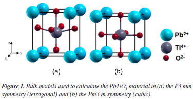 ![]() Figure 1. Bulk models used to calculate the PbTiO3 material in (a) the P4 mm symmetry (tetragonal) and (b) the Pm3 m symmetry (cubic)