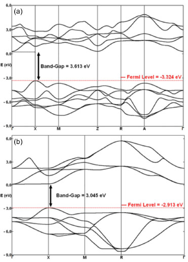 ![]() Figure 2. Band structures of (a) tetragonal and (b) cubic PbTiO3 phases. High symmetry points in the Brillouin Zone are described as Γ (0,0,0); X (0.5,0,0); M (0.5,0.5,0); Z (0,0,0.5); R (0.5,0,0.5); A (0.5,0.5,0.5); and Γ (0,0,0); X (0.5,0,0); M (0.5,0.5,0); R (0.5,0,0.5) for tetragonal and cubic phases, respectively