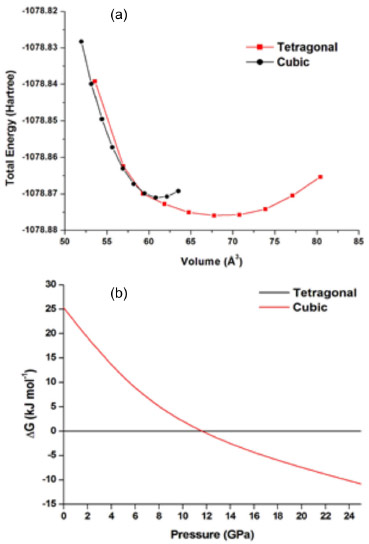 ![]() Figure 3. (a) Theoretical EOS curves for cubic and tetragonal phases. (b) Phase diagram for PbTiO3