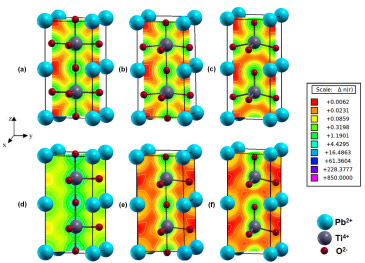 The redistribution of the electronic density is responsible for the piezoelectric properties of PT, resulting in loss of spontaneous polarization in the cubic phase. To investigate this loss, electronic density maps were analyzed for tetragonal and cubic symmetries (Figure 4). Electronic density maps were obtained from wave function and electronic density matrix isolines that describe the density in an area.46 For better visualization, the unit cell was expanded in the z-direction. These electronic density maps were described along the Ti-O bond direction of the material, which corresponds more specifically to the (111) and (010) Miller indices for cubic and tetragonal symmetries (Figure 4).