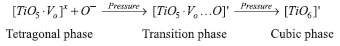 Another way to demonstrate this chemical process relies on the Kröger-Vink defect notation for crystalline structures.47 In this notation, the sign "x" represents the formation of a neutral cluster while the sign "'" denotes the accumulation of negative charge in the corresponding cluster. Researchers have used this notation to investigate optical and structural properties in electronic ceramics based on modifications of molecular clusters such as TiO6,48,49 WO4,50 and ZrO6.51 Therefore, the defect equation sequence proposed for this chemical process represents the transformation of the [TiO5.Vo]X cluster in the tetragonal phase into the [TiO6]' cluster in the cubic phase. These molecular clusters were chosen based on calculated bond lengths (Table 3).