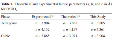 RESULTS AND DISCUSSIONS PT is well-known for its piezoelectric properties.39,40 Ferroelectric materials typically exhibit a spontaneous polarization in a direction than can be switched under an external electric field or stress. Piezoelectric PT exists as a noncentrosymmetric tetragonal crystal structure presenting a spontaneous polarization in the (001) direction because of the spatial displacement of the oxygen and titanium atoms with respect to the symmetry center position.41-43 In contrast, cubic PT does not exhibit spontaneous polarization and, therefore, no piezoelectric properties. However, a tetragonal-cubic phase transition is observed when pressure is applied to tetragonal PT. This pressure changes the molecular structure of PT, increasing the electronic energy and modifying its molecular energy state. From this perspective, piezoelectric phenomena are tetra-cubic phase transitions that can be investigated as chemical reactions in which the tetragonal phase is the reagent, the cubic phase is the product, and the activation energy is transferred through applied pressure. Possible molecular structures for the transition states of this chemical reaction may display a tetragonal or a cubic arrangement. Electronic structure Table 1 shows experimental and theoretical results for the tetragonal and cubic symmetries of PT. These data indicated that lattice parameters obtained in this study are in close agreement with experimental data and other theoretical studies.