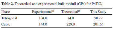 Changes in band gap stem from the influence of molecular organization on material electronic structure. Here PT showed a Fermi energy, or maximum valence band, of -3.324 eV in the tetragonal symmetry (Figure 2a) and -2.913 eV in the cubic symmetry (Figure 2b). However, the conduction band minima displayed the same energy for both phases, suggesting that band gap modifications mainly resulted from the redistribution of the electronic density in PT. A transition state displaying an indirect band gap of 4.28 eV was localized between X and Γ symmetry points. The Fermi energy for this phase equaled -3.147 eV; therefore, the PT transition state exhibited the same band gap orientation (indirect) between the same symmetry points as tetragonal PT. However, its band gap was considerably larger than those for cubic and tetragonal phases, and its Fermi energy was localized between the levels obtained for these phases. These results indicate that the PT transition state presents the same electronic features as tetragonal PT but its conduction band is significantly different. Bulk modulus and chemical transition state Table 2 shows experimental and theoretical results for the bulk modulus of PT. The data indicated that the theoretical bulk modulus obtained for the cubic phase was closer to experimental result than previous theoretical studies.16 However, theoretical results for the tetragonal phase deviated from other theoretical studies to a greater extent.16 These new theoretical results were obtained using a basis set combination, which previously showed that different basis set combinations provided different bulk modulus calculations.