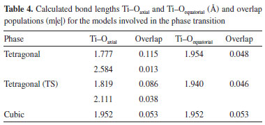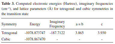 Departamento de Química, Universidade Estadual de Ponta Grossa, 84030-900 Ponta Grossa - PR, Brasil Recebido em 05/12/2013 * e-mail: srlazaro@uepg.br Resulting from ion displacement in a solid under pressure, piezoelectricity is an electrical polarization that can be observed in perovskite-type electronic ceramics, such as PbTiO3, which present cubic and tetragonal symmetries at different pressures. The transition between these crystalline phases is determined theoretically through the bulk modulus from the relationship between material energy and volume. However, the change in the material molecular structure is responsible for the piezoelectric effect. In this study, density functional theory calculations using the Becke 3-Parameter-Lee-Yang-Parr hybrid functional were employed to investigate the structure and properties associated with the transition state of the tetragonal-cubic phase change in PbTiO3 material. INTRODUCTION Quantum mechanical simulations of material molecular structures play an important role in explaining material properties at the molecular level. Ferroelectricity, piezoelectricity, pyroelectricity, and other properties depend on the molecular structure of the materials because electronic density changes according to composition, atomic organization, and chemical bond. Actually, several materials may exhibit similar properties but different structures. Therefore, organic, inorganic, and biological structures can display the same properties. For instance, organic and inorganic materials can present spontaneous polarization properties; organic, inorganic, and biological molecular structures may show optical properties. In particular, oxides called perovskites, which mainly consist of titanate materials,1,2 exhibit ferro-, piezo-, opto-, and pyroelectricity properties3-6 that have been extensively applied to electrical systems such as memories, gas sensors, and transducers.7-9 Ferro- and piezoelectric properties rely on material composition and arrangement. For instance, the ferro- and piezoelectricity of PbTiO3 (PT) in the tetragonal phase are macroscopically characterized by determining the d33 values in the [111], [011], and [001] directions, because these properties stem from linear combinations of microscopic vectors in these directions. Generally, domain-engineered Relaxor-PT single crystals present extremely large piezoelectric coefficients for the longitudinal vibration mode while crystals with single domain states display very low longitudinal properties and ultrahigh shear.10 PT single crystals have shown a high electromechanical coupling constant and a large spontaneous polarization.11-13 Kushida and Takeuchi reported the formation of PT thin films presenting electromechanical coupling constants reaching 0.8 on patterned Pt electrode films embedded in SrTiO3 single crystals by seeded lateral overgrowth. These constants resulted from the orientation of the electrode-supported PT thin film on the c-axis, showing that piezo- and pyroelectricity depended on crystallographic axis orientation in this material.11 PT exhibits tetragonal and cubic phases, of which the tetragonal phase forms a more stable structure under ambient conditions. Tetragonal PT presents ferroelectric properties, a P4 mm spatial group with experimental lattice parameters a and c of 3.904 (a = b) and 4.152 Å (c/a = 1.064), respectively, and an experimental band gap of approximately 3.4 eV. Cubic PT is a dielectric material displaying a Pm3 m spatial group, an experimental lattice parameter a of 3.865 Å (a = b = c), and an experimental band gap of 3.6 eV.14-19 The tetragonal-cubic phase transition relies on temperature and pressure. The ferroelectric-paraelectric phase transition of PT occurred at a Curie temperature Tc of 766 K.20 The bulk modulus is defined as the pressure required for triggering phase transition. The experimental bulk modulus amounts to approximately 104 and 144 GPa for tetragonal and cubic PT phases, respectively.19 Under pressure, crystal structure and physical properties can be effectively changed by variations in the atom positions in the unit cell and the electron density.21 In PT, tetragonality and ferroelectricity are suppressed with increasing pressure at ambient temperature to produce a paraelectric cubic phase above 12 GPa.22 In recent years, numerous theoretical and experimental studies have been developed to investigate the phase transition of different perovskites.23,24 Supercell-based density functional theory (DFT) simulations have shown that the formation energies of possible vacancies in the band gap range of PT depend on oxygen partial pressures. These authors observed the influence of oxygen partial pressures on vacancy energetic states in this material.25 DFT simulations based on spin Hamiltonian models and Green's function techniques have been performed to investigate the influence of oxygen vacancy on the ferromagnetic properties of ferroelectric perovskite nanoparticles. This study demonstrated that the oxygen vacancy changes the spin electronic structure of the ferroelectric perovskite ABO3 nanoparticles without requiring additional magnetic impurities such as Co, Fe, and Ni. Polarization and magnetization depend on particle size, and an intermediate size interval is observed for multiferroic ferroelectric nanoparticles.26 An ab initio model based on DFT and a plane wave approximation has been proposed to study the influence of applied electric fields on piezoelectric response in perovskite superlattices formed by PT/SrTiO3 and BaTiO3/CaTiO3 interfaces. This model provided a relationship between electric field, displacement field, and PT composition that explains how the interface between these materials is influenced mainly in the [001] direction.27 The determination of timescales to study the phase transition with respect to symmetry and nanodomains in perovskites superlattices suggested piezoelectric field distortions with analysis pulses of ap