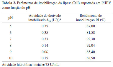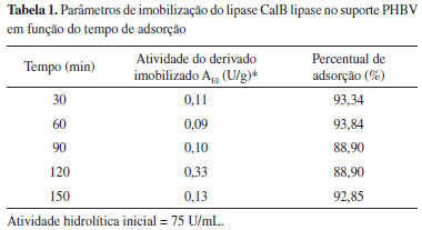 | Nanopartículas de poli-hidroxibutirato-co-valerato como suporte para a imobilização da lipase de Candida antarctica fração B Nanoparticles of poly(hydroxybutyrate-co-hydroxyvalerate) as support for the immobilization of Candida antarctica lipase (Fraction B). |