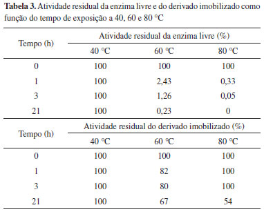 Estabilidade térmica do derivado imobilizado Após determinar a melhor condiçao para imobilizaçao da lipase em PHBV (120 min, pH 7) foi realizada a avaliaçao da estabilidade de temperatura da enzima livre e imobilizada em funçao do tempo, conforme apresentado na Tabela 3.