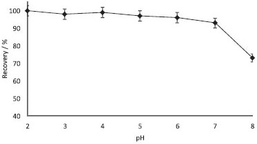 ![]() Figure 2. Influences of pH on the recoveries of Sudan Blue II (N= 3, 0.5 µg mL-1 of Sudan blue II, centrifugation speed: 2500 rpm, time: 5 min)