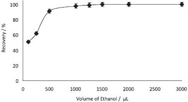 Nature and volume of the dispersant The nature of the disperser solvent was also evaluated in the current method. Ethanol showed higher recovery of Sudan Blue II, when compared with that from methanol, acetone, and acetonitrile. Furthermore, ethanol was less toxic and dissolved Sudan Blue II efficiently. The effect of the volume of ethanol on the extraction efficiency was also investigated. To obtain the optimized volume of ethanol, various experiments were performed to extract 0.5 µg mL-1 of Sudan Blue II using different volumes of ethanol (100-3000 µL). Quantitative recoveries were observed when the volume of ethanol was 1000-3000 µL (Figure 3). Accordingly, 1250 µL of ethanol was used for all subsequent experiments and analysis of real samples.