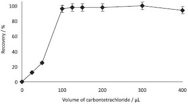 ![]() Figure 4. Effect of carbon tetrachloride volume on the recoveries of Sudan blue II (N=3, 0.5 µg mL-1 of Sudan blue II, pH: 4, volume of ethanol: 1.0 mL, centrifugation speed: 2500 rpm, time: 5 min)