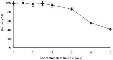 ![]() Figure 5. Effect of NaCl concentrations on the recoveries of Sudan Blue II (N= 3, 0.5 µg mL-1 of Sudan blue II, pH: 4, volume of ethanol: 1.0 mL, volume of carbon tetrachloride: 125 µL, centrifugation speed: 2500 rpm, time: 5 min)