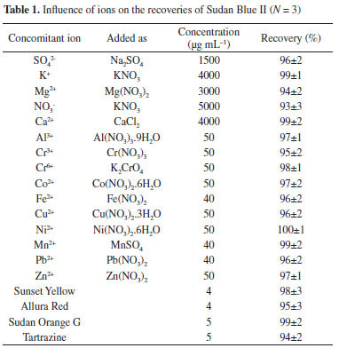 Effects of centrifugation speed and time The effect of centrifugation speed (500-4000 rpm) on the recoveries of Sudan Blue II in the DLLME procedure was examined. Quantitative recoveries (95%) were obtained at 2000-4000 rpm. The effects of centrifugation time (1-6 min) on the recoveries were also investigated. The recoveries of Sudan Blue II were higher than 95% in the range from 4 min to 6 min. Therefore, a centrifugation speed of 2500 rpm and a duration of 5 min was used in all subsequent studies. Effect of foreign ions The effects of the matrix components of the real samples are a critical parameter in microextraction studies, therefore, the influence of various cations, anions, and dyes on the recoveries of Sudan Blue II were investigated. The standard solution of Sudan Blue II (0.5 µg mL-1) was used as a reference. The results are given in Table 1. Tolerance limits were defined by the concentration of dyes, cations, and anions which caused an <5% error in the preconcentration and determination of Sudan Blue II. ![]()