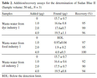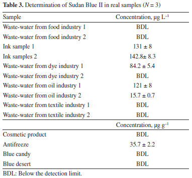 The method was also used to determine the Sudan Blue II content in candy, desert, cosmetic product, ink, antifreeze, and different industrial waste-water samples (Table 3). The levels of Sudan Blue in these samples were generally below the LOD of the method.