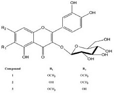EXPERIMENTAL Chemicals and reagents HPLC grade methanol (Merck, Darmstadt, Germany) and trifluoroacetic acid (TFA; Tedia, OH, USA) were used for the HPLC analysis. Deionized water (18 MΩ cm) from a Direct Milli-Q purification system (Millipore Co., Bedford, MA, USA) was used. Sep-Pak RP18 cartridges (1000 mg/6 mL) for solid-phase extraction (SPE) were purchased from Phenomenex Co. (Torrance, CA, USA). Flavonoids standards (1-3) were isolated from the hydroethanolic extract of the aerial parts of T. fluviatilis according to the procedures described in "Extraction and isolation of the flavonoids" section and then used as external standards. HPLC-DAD analysis of these flavonoid standards revealed a purity of 98%. Quercetin and gallic acid were purchased from Sigma-Aldrich (St. Louis, MO, USA). All others chemicals used were analytical grade and from commercial sources. Preparation of T. fluviatilis crude extract The aerial parts of T. fluviatilis (capitulae, scapes, and leaves) were collected in Bertioga City, São Paulo, Brazil, 23º46'26.64"S, 45º58'24.29" W, and identified by Dr. Mara Angelina Galvão Magenta from University Santa Cecilia (Unisanta) in Santos City, São Paulo state, Brazil. A voucher specimen (M. Magenta 729) was deposited at the Herbarium of the Unisanta (HUSC). The dried aerial parts of T. fluviatilis (352 g) were powdered and extracted with ethanol:water, (7:3, v/v) by percolation, at room temperature. The solution was evaporated to dryness in vacuo to give to give the crude hydroethanolic extract (66.2 g, 18.8%), which was stored at 4 ºC. Isolation of the flavonoids The hydroethanolic extract (2.35 g) was solubilized in methanol:water (7:3, v/v, 20.0 mL) using ultrasound for 10 minutes and then centrifuged for 15 minutes. The precipitate (0.25 g) was separated from the supernatant (2.10 g). The supernatant was filtered and chromatographed on Sephadex LH-20 (85 × 2.5 cm, i.d.) and eluted with methanol:water (7:3, v/v) to give 160 fractions (10 mL each). Fractions were analyzed by silica gel TLC (chloroform:methanol:n-propanol:water, 5:6:1:4, v/v/v/v, organic phase). Fractions 75-78 (24 mg) were combined and purified by solid phase extraction (SPE) using Phenomenex Strata C18 cartridge (1000 mg of stationary phase) that was previously activated with MeOH (5 mL) and equilibrated with MeOH:H2O (7:3, v/v; 5 mL). The fractions eluted from cartridge using MeOH:H2O (7:3, v/v; 15 mL) afforded the compound identified as 6,7-dimethoxyquercetin-3-O-β-D-glucopyranoside (1, 19 mg). Fractions 97-160 (86 mg) were combined and further purified by semipreparative HPLC on a Varian (Walnut Creek, CA, USA) chromatograph, equipped with a photodiode array detector (330 model Varian) and injector with a loop (500 µL) A Phenomenex Luna (2) RP18 column (250 × 10 mm i.d., 10 µm) along with the protective guard column Phenomenex (4 cm × 3 mm) was used in the purification. The purification was performed using an isocratic mode, where the eluent 40% methanol (0.1% TFA) and 60% water (0.1% TFA), had a flow rate of 2 mL min-1. Monitoring the separation of compounds at 270 nm led to the isolation of 6-hydroxy-7-methoxyquercetin-3-O-β-D-glucopyranoside (2, 11.4 mg), 6-methoxyquercetin-3-O-β-D-glucopyranoside (3, 4.3 mg), and the compound 6,7-dimethoxyquercetin-3-O-β-D-glucopyranoside (1, 9.2 mg), which had been isolated earlier. The software ProStar was used to control the semipreparative system, data collection, and processing. Structural identification of the compounds Compounds were characterized by NMR (1H, 13C, and 2D) analysis on a Varian INOVA 500 operating at 500 MHz for 1H, and at 125 MHz for 13C (11.7 T) and 2D-NMR, with TMS as the internal standard and by comparison with the data reported previously for 6,7-dimethoxyquercetin-3-O-β-D-glucopyranoside (1),15,16 6-hydroxy-7-methoxyquercetin-3-O-β-D-glucopyranoside (2),12 and 6-methoxyquercetin-3-O-β-D-glucopyranoside (3).17 An LCQ Fleet ion trap mass spectrometer with Xcalibur (software version 2.1; Thermo Scientific) and equipped with an electrospray ionization (ESI) interface was used for MS and multi-stage (MSn) analysis. Each compound was dissolved in methanol and infused in the ESI source by a syringe pump (flow rate = 5 µL min-1). High purity nitrogen (N2) was used as the nebulizing gas and ultra-high purity helium (He) was used as the collision gas, at flow rate of 10 arbitrary units. Mass acquisition parameters in negative ion mode were as follows: spray voltage, 5 kV; capillary voltage, -25 V; tube lens offset voltage, -126 V; capillary temperature, 275 ºC. The first event, the full-scan MS data were recorded within range from m/z 50 to m/z 1000. The second event was the MS/MS experiment during which data-dependent scanning was initiated for identifying fragments of deprotonated molecules at normalized collision energy of 25 and activation time of 30 ms. These spectra are included in the Supplementary Material (Figures 1S-16S). Sample preparation Two samples of the hydroethanolic extract (50 mg) were separately dissolved in a solution of spectroscopy grade methanol:water (7:3, v/v; 5.0 mL) under the influence of ultrasound for 5 minutes. The samples were then filtered through a 0.22 µm polytetrafluoroethylene (PTFE) membrane filter and aliquots (10 µL) were directly injected into HPLC-DAD analytical system. This procedure was performed by two different analysts. All solutions were stored below 4 ºC. HPLC-DAD analysis The hydroethanolic extract obtained from aerial parts from T. fluviatilis and the isolated flavonoids (1-3) were analyzed on the HPLC equipment Jasco (Tokyo, Japan) equipped with a PU-2089 quaternary solvent pump with degasser, a MD-2018 DAD detector, and a Rheodyne AS-2055 sample injector with a 100 µL sample loop. The analytical column was a Phenomenex Synergi Hydro RP18 (Phenomenex, Torrance, CA, USA) (250 × 4.6 mm i.d.; 4 µm) equipped with a Phenomenex security guard column (4.0 × 2.0 mm i.d.)