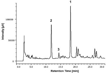 ![]() Figure 2. HPLC-DAD chromatogram for the quantification of the compounds 1-3 in the hydroethanolic extract of the aerial parts of T. fluviatilis monitored at 270 nm. A Phenomenex column (Synergi Hydro, Phenomenex, Torrance, CA, USA), RP18 (250 × 4.6 mm i.d.; 4 µm) equipped with a Phenomenex security guard column (4.0 × 2.0 mm i.d.) was used. The gradient program with methanol (B):water (A) (both with 0.1% TFA) flowing at a rate of 1.0 mL min-1 was: 36-60% B (0-30 min), 60-100% B (30-31 min). The volume of injection was 10 µL