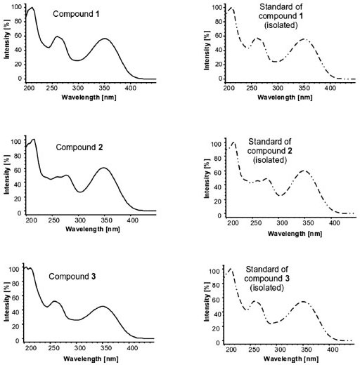 ![]() Figure 3. UV spectra of compounds 1-3 present in the hydroethanolic extract of the aerial parts of T. fluviatilis and the spectra of corresponding purified compound, used as standard
