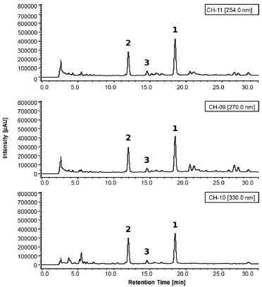 ![]() Figure 4. Representative HPLC-DAD chromatograms, monitored at 254 nm, 270 nm, and 330 nm, showing the separation of compounds 1-3 present in the hydroethanolic extract of T. fluviatilis. These chromatograms were used for quantification of compounds 1-3 (for chromatographic conditions, see Figure 2)