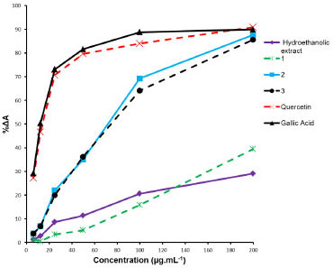 ![]() Figure 5. Antiradical activity of the hydroethanolic extract, flavonoids 1-3 isolated from T. fluviatilis, and the standards (gallic acid and quercetin) determined by DPPH assay