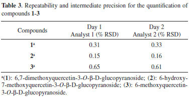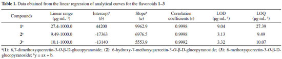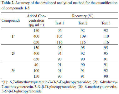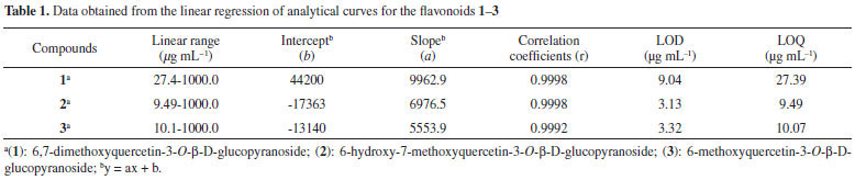 Linearity and sensitivity Analytical curves were constructed using the substances isolated (1, 2, and 3) from the hydroethanolic extracts of the aerial parts of T. fluviatilis. The analytical method was calibrated with a standard at seven different concentration levels (10, 50, 75, 100, 250, 500, and 1000 µg mL-1) in triplicate and the response absorption obtained at 270 nm. The areas under the chromatographic peaks were determined and cast as a function of concentration using linear regression. The linearity of the compounds (1-3) was obtained from the correlation coefficient of the linear regression within the range of concentrations studied. All analytes showed excellent linearity within the range studied, which could be verified by the values of the correlation coefficient (r) of standard curves (>0.999) and the sensitivity of the method was expressed by LOD and LOQ (Table 1).