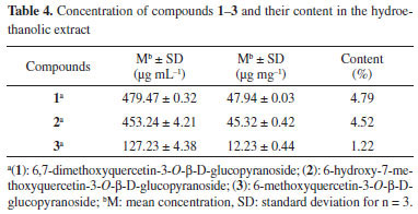RESULTS AND DISCUSSION Analysis of the hydroethanolic extract of the aerial parts of T. fluviatilis by HPLC-DAD showed the presence of three flavonoids (Figure 1). The compounds were identified by comparison of the retention time and UV spectra of the peaks with those of the available reference standards and confirmed by spiking the hydroethanolic extract with isolated compounds (1-3). With DAD, it was possible to obtain the UV spectra (200-400 nm) of each peak, which permitted the selection of a suitable wavelength at which to maximize the detection of the constituents of hydroethanolic extract, thus minimizing any interference. According to the profile of the corresponding UV spectra, a wavelength of 270 nm was determined to be most appropriate to ensure maximum detection and simultaneous analyses of all compounds present in the hydroethanolic extract. The UV spectra of the peaks corroborated the presence of flavonoids with bands at 240-285 nm and 300-380 nm.23