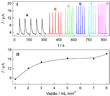 ![]() Figura 1. (I) Sinais transientes obtidos para injeçoes de uma soluçao de [Fe(CN)6]4- 1,0 mmol L-1 em diferentes vazoes. Transportador: KCl 0,1 mol L-1. Volume de amostra: 50 µL. Percurso analítico: 10 cm. Edetecçao = +0,4 V/50 ms e Eregeneraçao = -0,6 V/50 ms. Vazoes: (A) 1; (B) 2; (C) 3; (D) 5; (E) 7 e (F) 8 mL min-1. (II) Variaçao da corrente em funçao da vazao