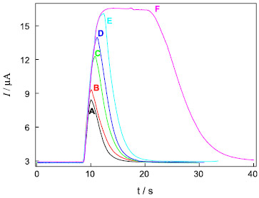 ![]() Figura 2. Sinais transientes obtidos para injeçoes de uma soluçao de [Fe(CN)6]4- 1,0 mmol L-1 com diferentes alças de amostragem. Transportador: KCl 0,1 mol L-1. Vazao: 3,0 mL min-1. Percurso analítico: 40 cm. Edetecçao = +0,4 V/50 ms e Eregeneraçao = -0,6 V/50 ms. Volume de amostra: (A) 25; (B) 50; (C) 110; (D) 150; (E) 200 e (F) 750 µL