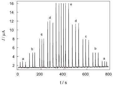 ![]() Figura 3. Sinais transientes obtidos para injeçoes de soluçoes de [Fe(CN)6]4- em diferentes concentraçoes. Transportador: KCl 0,1 mol L-1. Vazao: 3,0 mL min-1. Volume de amostra: 50 µL. Percurso analítico: 10 cm. Edetecçao = +0,4 V/50 ms e Eregeneraçao = -0,6 V/50 ms. (a) 0,10; (b) 0,25; (c) 0,50; (d) 0,75 e (e) 1,0 mmol L-1