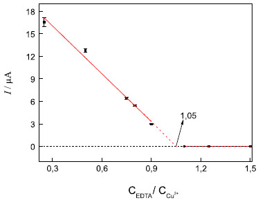 Desta forma, verificou-se que o sistema proposto permite que os efeitos dos principais parâmetros operacionais de um sistema FIA sejam estudados. Entretanto, é preciso mencionar que, do ponto de vista de eletroquímica fundamental, o sistema proposto apresenta algumas limitações. A primeira delas está relacionada ao fato do eletrodo de pseudo-referência estar localizado entre os dois outros eletrodos, o que o expõe ao efeito das linhas de campo que surgem devido ao fluxo de corrente entre o eletrodo de trabalho e o contra-eletrodo. Nestas condições podem haver distorções e uma distribuição de potencial ao longo da agulha que atua como pseudo-referência.29 Além disso, um potencial é gerado no eletrodo de pseudo-referência devido ao par [Fe(CN)6]3-/[Fe(CN)6]4-, sendo este potencial dependente das concentrações relativas da forma oxidada e reduzida deste par redox. Portanto, a célula eletroquímica utilizada neste trabalho não permite um controle eficiente do potencial do eletrodo de trabalho, pois o potencial do eletrodo de pseudo-referência poderá não permanecer exatamente constante. No entanto, resultados satisfatórios foram obtidos com a célula eletroquímica proposta, pois nos potenciais de detecção escolhidos, a corrente estava no seu valor limite e, portanto, pequenas variações no potencial não geram variação na corrente detectada. É imprescindível que estas limitações sejam apresentadas e discutidas com os estudantes para que estes entendam que a célula eletroquímica proposta fornecerá resultados satisfatórios apenas em condições experimentais específicas e que, portanto, seu uso não deve ser estendido para estudos fundamentais em eletroquímica ou em eletroanalítica. Determinação da estequiometria do complexo Cu-EDTA Visando avaliar a versatilidade do sistema FIA proposto e explorar ao máximo suas aplicações didáticas, o sistema proposto também foi empregado para determinar a estequiometria do complexo formado entre o Cu2+ e o EDTA. O Cu2+ na sua forma livre pode ser reduzido a cobre metálico na superfície do eletrodo, gerando uma corrente de redução. Por outro lado, a formação do complexo Cu2+-EDTA estabiliza o Cu2+, fazendo com que a redução deste ao estado metálico ocorra em potenciais muito mais negativos. Desta forma, escolhendo-se um potencial de detecção no qual apenas o Cu2+ livre seja reduzido, deve-se observar uma diminuição linear do sinal amperométrico à medida que a razão molar EDTA/Cu2+ aumenta. Este decréscimo do sinal deve ser observado até a razão molar correspondente à estequiometria do complexo, situação na qual a corrente tende a zero, pois todo o Cu2+ estará complexado. A variação da corrente de redução do Cu2+ em função da razão molar EDTA/Cu2+ é apresentada na Figura 4.