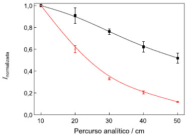 As correntes detectadas na redução de [Fe(CN)6]3- foram normalizadas, atribuindo-se 100% ao sinal fornecido pelo menor percurso analítico (10 cm). A normalização foi necessária, pois houve ligeira variação da corrente com o pH, assim, a normalização permite a comparação direta entre os resultados obtidos nos dois valores de pH. A queda na corrente de redução (diminuição da concentração de [Fe(CN)6]3-) observada na Figura 5 deve-se a dois fatores: aumento da dispersão da zona da amostra e do tempo de reação (consumo de [Fe(CN)6]3-). A queda na corrente de redução devido à dispersão da zona da amostra é independente do pH, assim, a queda mais acentuada observada em pH 6 demonstra que a reação entre o ácido ascórbico e o íon [Fe(CN)6]3- ocorre mais rapidamente em pH 6 do que em pH 4, o que é concordante com o esperado para esta reação química.10 O efeito da reação química sobre a concentração do íon [Fe(CN)6]3- também pode ser visualizado na Figura 10S. Esta figura mostra os sinais transientes obtidos na injeção de solução contendo [Fe(CN)6]3- sem e com a presença de ácido ascórbico para um mesmo percurso analítico. O fato da injeção da mistura produzir um sinal menor confirma que, além da dispersão da zona da amostra, a reação química também contribui para a diminuição do sinal do [Fe(CN)6]3-. Neste experimento, na injeção do [Fe(CN)6]3- sem a presença de ácido ascórbico, a outra alça de amostragem foi preenchida com o transportador (diluição constante em ambos os experimentos). Assim, estes resultados demonstraram que o sistema FIA proposto na configuração de zonas coalescentes pode ser empregado para um estudo qualitativo do efeito da acidez sobre a cinética da reação entre o íon [Fe(CN)6]3- e o ácido ascórbico. Este experimento também foi previamente explorado para fins didáticos empregando-se um sistema FIA com detecção espectrofotométrica.10 Os resultados obtidos no presente trabalho foram concordantes com os descritos por Rocha et al.,10 indicando, portanto, que o sistema FIA proposto pode ser empregado de forma similar a outros sistemas descritos na literatura para aplicações didáticas sobre FIA.
