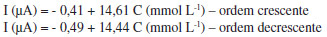 As soluções padrão contendo [Fe(CN)6]4- foram injetadas em ordem crescente e decrescente de concentração. Tanto nas injeções das soluções em ordem crescente quanto decrescente foram observadas respostas lineares entre a corrente de oxidação e concentração de [Fe(CN)6]4-, (R > 0,99). Neste estudo, as seguintes equações de reta foram obtidas: