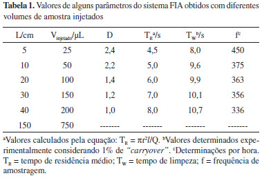 A Figura 2 também mostra um comportamento típico, o aumento do sinal e um alargamento dos picos com o aumento do volume da amostra, o que é consequência da menor dispersão sofrida pela zona central da amostra quando maiores volumes são injetados.13 A dispersão da zona da amostra é determinada basicamente por dois fatores: a convecção devido ao movimento em direção ao detector e a difusão.13,28 Estes dois fatores são mais efetivos nas fronteiras entre a zona da amostra e o transportador. Aumentando-se o volume da amostra, aumenta-se a porção central da zona da amostra, região na qual os fatores responsáveis pela dispersão são menos efetivos, portanto, a dispersão é diminuída com o aumento do volume de amostra injetado.13,28 Para o volume injetado de 750 µL, observou-se a formação de um patamar no sinal transiente, indicando uma situação próxima a condição de volume infinito, ou seja, situação na qual não há dispersão.13 O grau de dispersão para os diferentes volumes de amostra injetados foi avaliado através do coeficiente de dispersão (D), o qual pode ser calculado pela razão entre a corrente em condições de volume infinito (volume injetado de 750 µL) e a corrente obtida com os demais volumes de amostra injetados. A Tabela 1 apresenta os valores de D calculados para os diferentes volumes injetados (Vinjetado), os quais podem ser estimados pela equação: Vinjetado = πr2l, onde r é o raio interno e l é comprimento da alça de amostragem.
