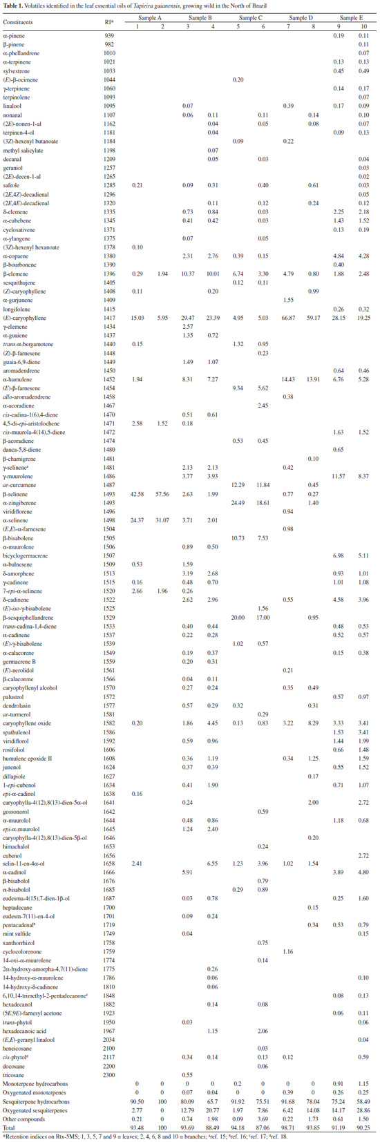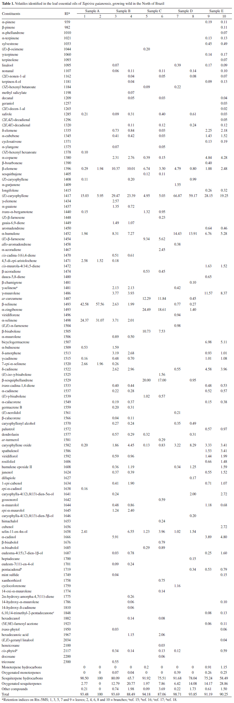 EXPERIMENTAL Botanical material Sample A (September, 2007) was taken from the sandbank forest of Marieta beach, which is located near to Vila da Penha Community (00º35'50" S/47º26'35.5" W), which is located in the municipality of Maracanã and is under the domain of the Extractive Reserve of Maracanã (Resex Maracanã). Samples B, C, and D (August, 2009) were taken in the sandbank forest of Algodoal Island (Maracanã), in the municipality of Maracanã, which is under the domain of the Environmental Protection Area Algodoal/Maiandeua (00º35'19.8" S/47º34'27.7" W). Sample E (October, 2009) was taken in the area closer to the shore of Vila da Penha Community. Voucher specimens (Sample A: MG 189,996; Sample B: 196,815; Sample C: 196,819; Sample D: 196,826; Sample E was identified by comparison with the other cited voucher of T. guianensis. Vouchers were deposited in the Herbarium MG of the Museu Paraense Emílio Goeldi (MPEG). The samples were dried for 7 days in an air-conditioned room (at low humidity) and then ground. Extraction of volatile compounds The dry plant material was hydrodistilled for 3 h, using a Clevenger-type apparatus with maintenance of the refrigeration water in 15 ºC. The oils obtained were centrifuged for 5 min (3,000 rpm), dried over Na2SO4, and centrifuged again in the same conditions. The hexane solution (1 mL) containing 2 µL of the oil was submitted for GC-MS analysis. The total oil yield was expressed in percentage (volume∙mass-1) on the basis of dried material. The amount of water was measured using infrared light on a Marte ID-50 device. Analysis of volatile compounds The oils were analyzed using a Shimadzu GC/MS Model QP 2010 Plus, equipped with a Rtx-5MS (30 m × 0.25 mm; 0.25 µm film thickness) fused silica capillary column. Chromatographic conditions included helium as carrier gas at 1.2 mL∙min-1; splitless injection of 1 µL, of the hexane solution; injector and interface temperature at 250 ºC; oven temperature program 60-240 ºC at 3 ºC∙min-1. EIMS: electron energy, 70 eV; ion source temperature at 200 ºC. Identification of the compounds were made by comparison of their GC mass and retention data with those in NIST-05 library, and cited in the literature.14-18 Retention indices were calculated using n-alkane standard solutions (C8-C26) available from Fluka S. A., in the same chromatographic conditions.