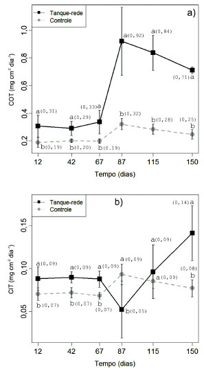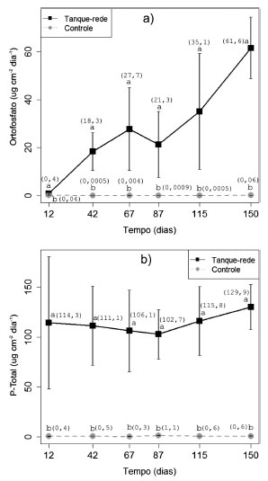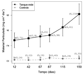 A sedimentaçao de P-Total fora significativamente superior para a regiao dos tanques-rede durante todo o período de tempo considerado (Figura 4), sendo observado um decréscimo nas taxas durante a primeira metade do cultivo, com um subsequente aumento até o final do período considerado. Para o controle o comportamento foi semelhante, com um pico de elevaçao de P-Total aos 42 dias de cultivo, com subsequente decréscimo até os 67 dias e posterior elevaçao nas taxas até o final do período considerado. A sedimentaçao do ortofosfato foi significativamente superior para os tanques-rede, e crescente ao longo do tempo de cultivo, enquanto na regiao controle nao houve uma tendência nem de acréscimo nem de decréscimo desta taxa ao longo do tempo, permanecendo durante todo o cultivo com valores próximos a zero (Figura 4).