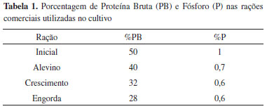 Delineamento amostral No reservatório está instalada uma estaçao de piscicultura, com cultivo intensivo de tilápia-do-Nilo em tanques rede. A fim de avaliar sua influência sobre o reservatório, foi feito o acompanhamento da produçao de 22 tanques-rede, do povoamento até a despesca, totalizando 150 dias de cultivo. A produçao durante um ciclo (150 dias) foi de 6258 kg de peixe. Como principal aporte de nutrientes para o sistema, a piscicultura utiliza quatro raçoes comerciais com diferentes composiçoes, a saber: Inicial até 21 dias, Alevino até 42 dias, Crescimento até 87 dias e Engorda até 150 dias (Tabela 1).