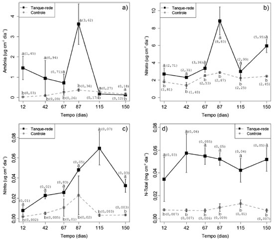 A sedimentaçao de N-Total foi significativamente maior para a regiao dos tanques-rede (Figura 3). Foi percebida uma elevaçao nas concentraçoes de N-Total até o 42º dia, com um decréscimo acentuado logo após este período, e posterior elevaçao das concentraçoes até o fim do cultivo. Para a sedimentaçao na regiao controle, foi observado um comportamento semelhante, com maiores concentraçoes na segunda metade do período de tempo considerado, particularmente após o 67º dia de cultivo. A sedimentaçao de amônia mostrou uma tendência decrescente ao longo do período de cultivo, sendo significativamente maior que na regiao de controle. As sedimentaçoes de nitrito e nitrato também foram significativamente superiores, apresentando, porém, uma tendência crescente do início ao fim do período de cultivo (Figura 3).