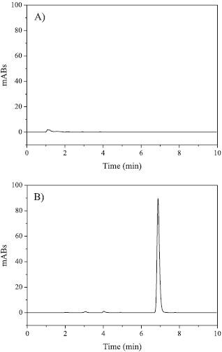 ![]() Figure 2. Xanthyletin chromatograms indicative of method specificity. Chromatograms were obtained following injection of (A) empty nanocapsules and (B) colloidal dispersion loaded with xanthyletin