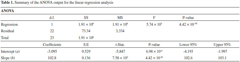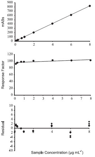 The standard deviations of the values of a (slope coefficient) and b (intercept coefficient) are indicated in parentheses. The correlation coefficient, which was obtained by regression analysis, was r2 = 0.9999, and the data indicates a P-value < 0.05 by ANOVA, as listed in Table 1. A value for r2 greater than 0.999 indicates a good correlation of linearity for all the concentrations used and a homoscedastic distribution of replicates at all levels that were applied in the calibration curve assembly. The small P-value indicates a strong relationship between the y and x values. Moreover, the ANOVA output of the linear regression model described in Table 1 further confirms the linearity and sensibility of the model. It was observed that the slope of the calibration curve was very significantly different from zero (P-value < 0.05) in accordance with a high sensibility for the method.