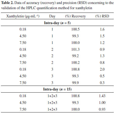 The response factor plot shown in Figure 3b and the residuals plot shown in Figure 3c were also utilized to confirm the linearity of the analytical method. Plotting the response factors of each standard solution over the work range revealed a slope close to 1.0 (1.01) and a 3.78% RSD between all levels of concentration patterns, further substantiating the linearity of the method. The residual values of each standard sample that was used to build the calibration curve were scattered randomly about zero, and exhibited no trends of expansion with respect to concentration. The working range of the method (i.e., the concentration of the analysis aliquot from 0.15 to 8.0 µg mL-1) allowed assay of the xanthyletin content within the limits of interest, and proved to be linear. Accuracy and precision of the method The accuracy may be analyzed by calculating the average percentage recoveries for the analyte at three different concentrations and the relative standard deviation (RSD).35 Thus, the three standard solutions chosen were 0.18, 4.5, and 7.5 µg mL-1. The concentrations chosen should be within the linear working range and be different from those used in the calibration curve. Table 2 summarizes the accuracy values, which are expressed as percent recovery. The recovery data were 99.9 ± 1.06%, showing a strong agreement between the experimental and nominal values.
